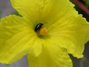 膨らんでます 2008年7月12日 いつも天気悪いなぁと思って写真を見ていましたが、逆光で撮影していたので、空が白くとんでいるだけでした。ストロボ飛ばしたら、空が青くなりました。 ゴーヤの実が生長しています。ただ、実にならない花があまりにも多いのが気になってます。 これが花。可憐できれいです。 虫がやってきて、おしべとめしべが………、 受粉して花の中心部分(おしべとめしべ?)が変化して、実もつく……って思ってます。いいかげんな解釈です。 現在一番デッカイ実(?)です。