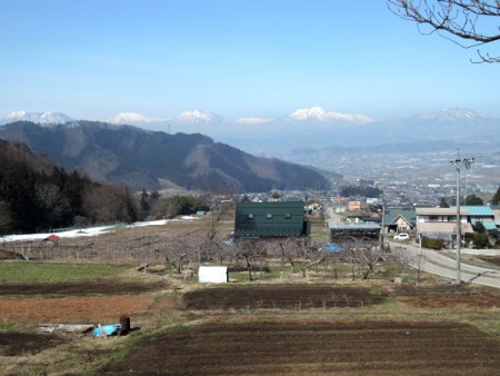 先日は旧北国街道を走ったので、今日はもうちょっと山際を走る北信濃フルーツ街道を走った。りんご畑、ぶどう畑が両側に広がる、まさにフルーツ街道。高台を走る区間もあるので、善光寺平、そしてその向こうに北アルプスや北信五岳の稜線がきれいに見える。この日は残念ながら、黄砂なのか、稜線がかすんでしまっていた。